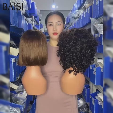 48H Livraison TVA 0€ BAISI 2 perruques pixie Offre spéciale 120€ 4X4 lace closure lisse 10 pouces marron 1BT4# et sans colle bob avec frange water wave en 100% vrais cheveux humains