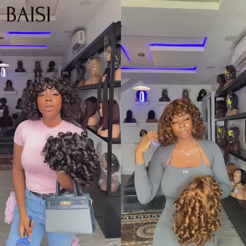 48H Livraison TVA 0€ BAISI 2 Perruques 129€ Perruques en Gros Sans Colle Facile à Porter egg wave avec Frange Marron et NOIR en 100% vrais cheveux humains, Code: FR20