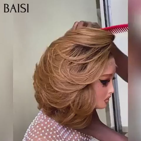 BAISI 13X4 Lace Frontal Perruque Bouclée Wave 69€ pixie Qualité TOP en Couleur Mixte miel en 100% Cheveux Humains