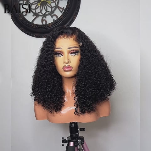Achetez 2 Prix D'usine BAISI Achetez 2 perruques minimum au prix d'usine fournisseur Perruque T-part afro curly 18 Pouces ou Bob Bouclée Curly avec Frange en Noir Chataîn #1B#4 (Pas Besoins De Code)