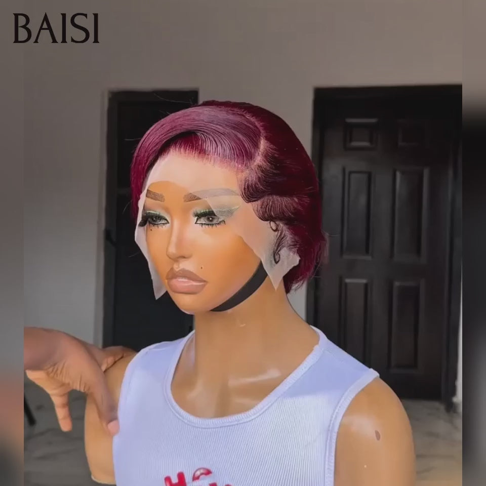 Achetez 2 Prix D'usine BAISI Achetez 2 perruques minimum au prix d'usine fournisseur Perruque 13x4 lace frontal pixie Lisse Bordeaux 99J# (Pas Besoin de Code)