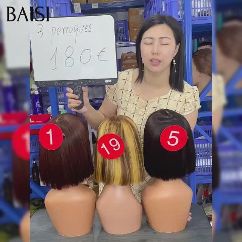 BAISI Lot de 3 perruques Flash Offer PROMOTION 180€ 3 couleur avec Frange Marron et NOIR et 13x4 lace Lisse Mixte 8 Pouces en 100% vrais cheveux humains