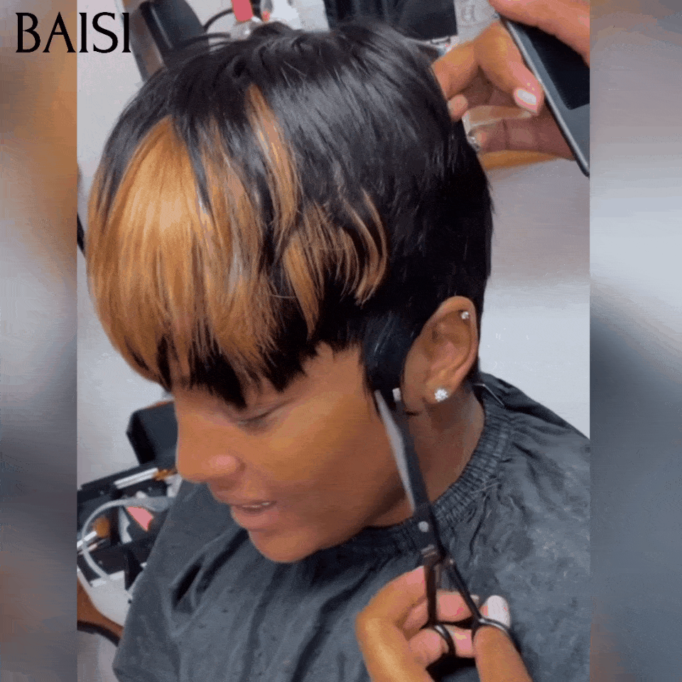 48H Livraison TVA 0€ BAISI Perruque Pixie 47€ Lisse NOIR ou Mixte sans Colle sans lace Couleurs personnalisées en 100% Cheveux Humains